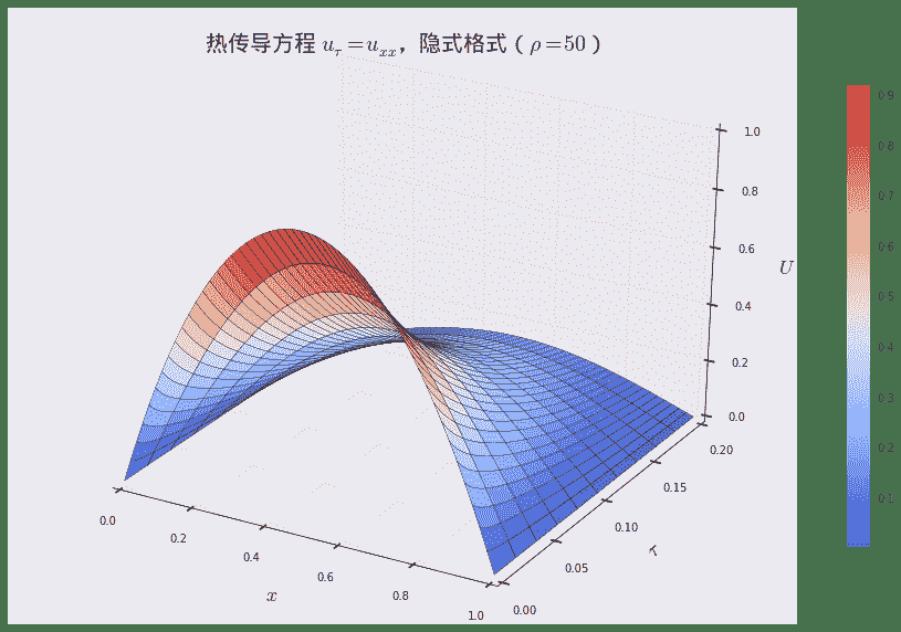 plotSurface(xGrids, tGrids, U[:,:int(0.2 / dt) + 1], title = u"热传导方程 $u_\\tau = u_{xx}$,隐式格式($\\rho = 50$)", xlabel = "$x$", ylabel = r"$\tau$", zlabel = r"$U$")