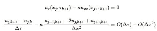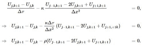 像上一天一样,我们从差分格式的数学表述开始。隐式格式与显式格式的区别,在于我们时间方向选择的基准点。显式格式使用k,而隐式格式选择k+1: