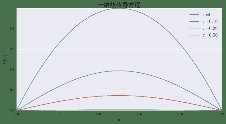 plotLines([U[:,0], U[:, int(0.10/ dt)], U[:, int(0.20/ dt)], U[:, int(0.50/ dt)]], xArray, title = u'一维热传导方程', xlabel = '$x$',
