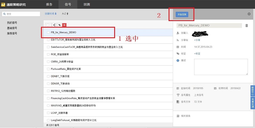 第二步:选中上传的新信号,点击 ‘开始回测’;