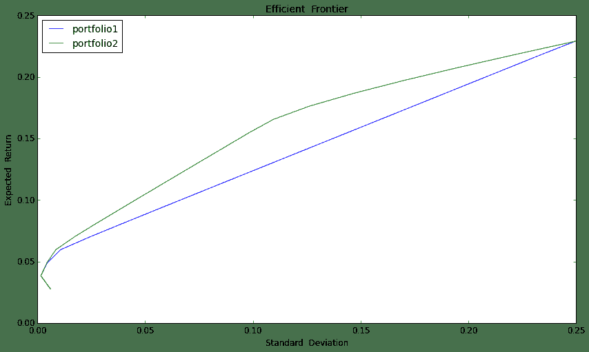 ax1.legend(['portfolio1','portfolio2'], loc = 'best', fontsize = 14)