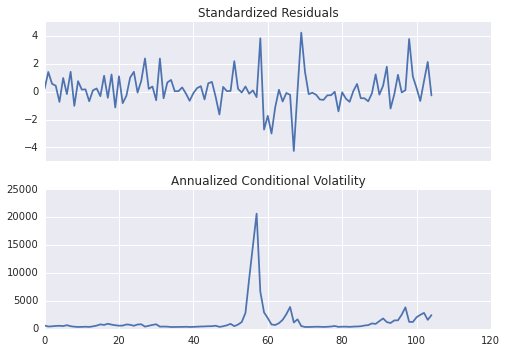 下面的图标,展示了标准化后的新息和条件波动率的情况。可以看出,虽然进行了标准化处理,一些位置还是出现了较大的误差(通过振幅来看)