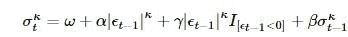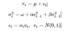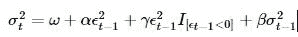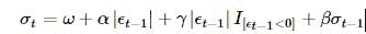 arch_model 在构建模型时,还可以添加附加参数。在这个例子中,设置o为1, 即包含了非对称冲击的一阶滞后项,从而将原GARCH模型转换为一个GJR-GARCH模型。新的模型具有动态方差,由下面公式给出: