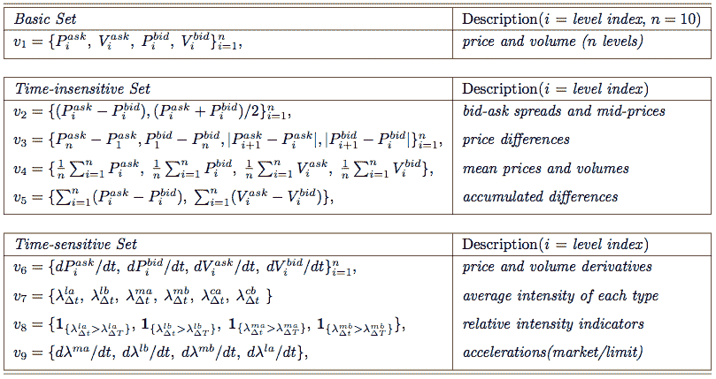 对order book数据做处理后,可以提取到我们需要的特征向量。总的特征分为三类:基本、时间不敏感和时间敏感三类,这里我们能从数据中获得全部的基本和时间不敏感特征,以及部分时间敏感特征,具体的见图片,或者进一步阅读文献。