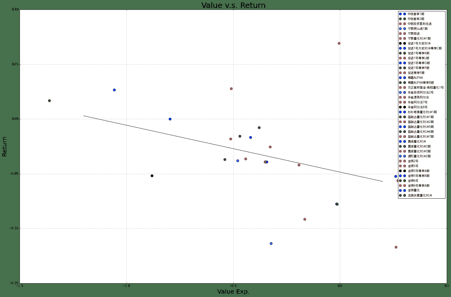 我们用上节得到的因子权重,与2014年12月初的那一周收益率进行对比。为了更加的一目了然,我们分别按照“市场 v.s. 收益”、“规模 v.s. 收益”、“价值 v.s. 收益”三个维度进行分析。通过散点图,很清楚的显示,市场因子在这一周对于alpha基金的收益的贡献是正向反馈效应;相反的,规模以及价值因子对于alpha基金的收益是负反馈。