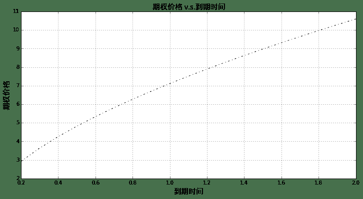 pylab.title(u'期权价格 v.s.到期时间', fontproperties = font)