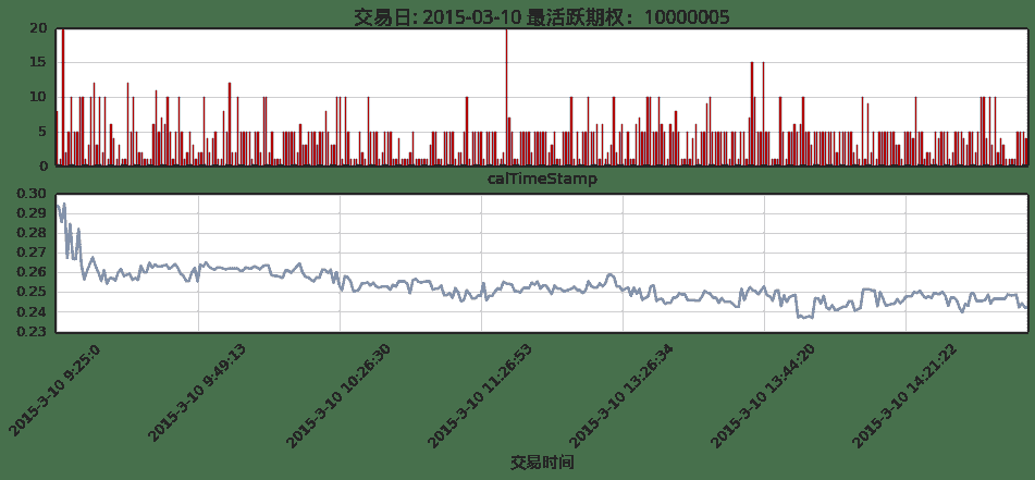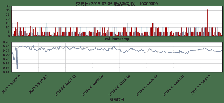 ax.set_title(u'交易日: ' + unicode(d) + u' 最活跃期权:'+ unicode(sample.index[0][1]), fontproperties = font, fontsize = 18)