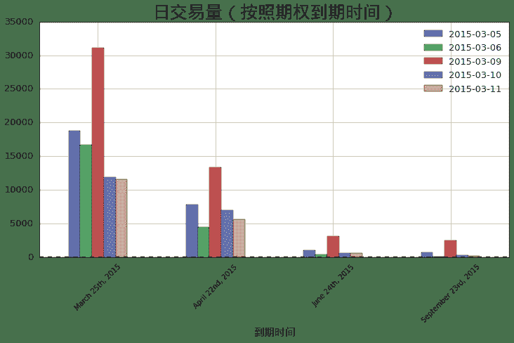 ax.set_title(u'日交易量(按照期权到期时间)', fontproperties = font, fontsize = 25)