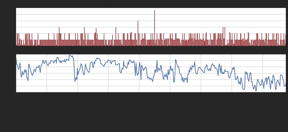 ax = base.plot(x = 'calTimeStamp', y = ['volume'], kind = 'bar', sharex=True, xticks = [], color = 'r', ax = axs[0])