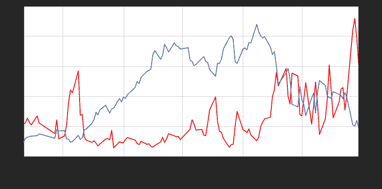 ax1 = histPCR.plot(x=histPCR.index, y='PCR', style='r')