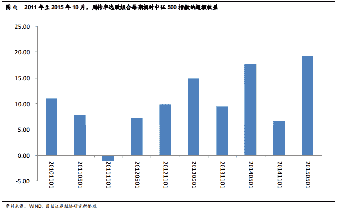 上图显示, 从绝对收益角度来看,周转率选股模型在 2011 年 11 月至 2013 年 4月这三期当中绝对收益为负; 2011 年 5~10 月,虽然整体市场下跌,但模型组合绝对收益为正; 2015 年 5~10 月,市场先扬后抑,但模型组合仍斩获正收益。