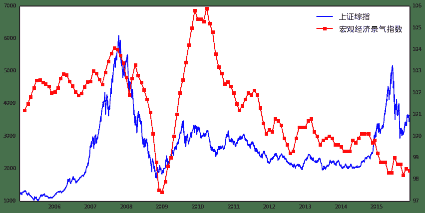 • 蓝线代表上证综指(日度数据)、红线代表宏观经济景气指数(月度数据)