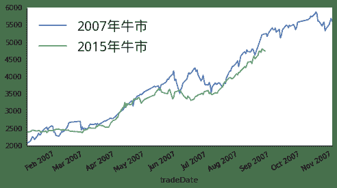 plt.legend([u'2007年牛市', u'2015年牛市'], prop = font, loc = 'best')