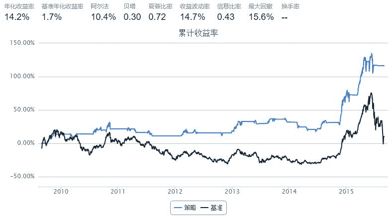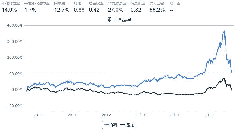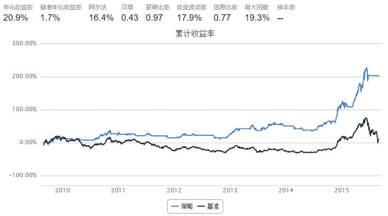 可以看出,策略在股市处于震荡市和牛市中,表现很好;而在熊市和暴跌中,表现的非常差,最大回撤很大。这从阿隆指标的构造中,就可以理解,阿隆指标是一个跟踪趋势的指标,在震荡市和牛市中,都能精选出股票,超越指数;然而在暴跌中,处于上升趋势的股票可能跌的更惨,倾巢之下,焉有完卵。。。