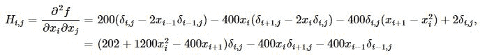 这里可使用共轭梯度近似Hessian矩阵的逆矩阵。下面给出Rosenbrock函数的Hessian矩阵元素通式: