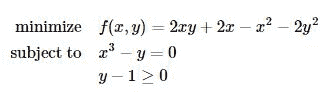 cons = ({'type': 'eq', 'fun': lambda x: np.array([x[0]**3 - x[1]]), 'jac': lambda x: np.array([3.0*(x[0]**2.0), -1.0])},